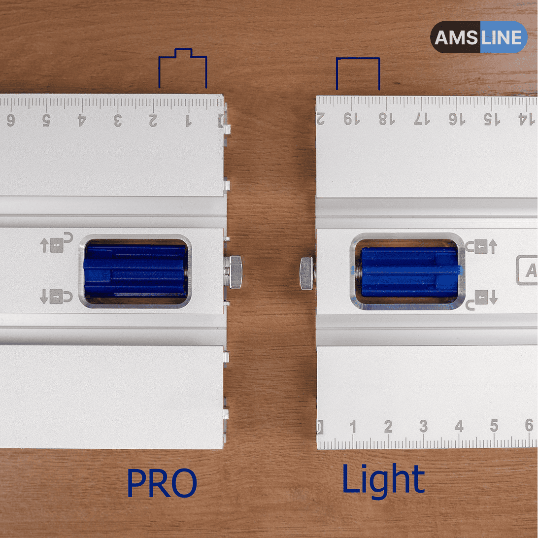 Модель Pro от модели Lite отличается нанесением шкалы разметки с двух сторон профиля и количеством регулируемых фиксаторов-барашков синего цвета (Pro - 8 шт, Lite - 4 шт).