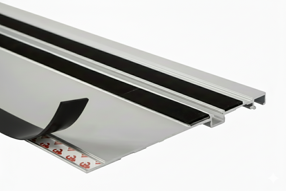 Сначала на направляющую шину клеится скотч. Далее на скотч приклеится противоскольная лента. Лента идет в комплекте со скотчем 15мм. Скотч - Двухсторонняя клеевая лента, полиэфир, акриловый адгезив, 0.205 мм, 15 мм, прозрачная.